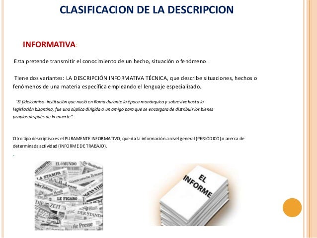 Clasificacion de la descripcion. Sus rasgos físicos estatura corpulencias facciones etc. No requiere del lenguaje especializado. -La descripción puede ser informativa técnica y literaria.