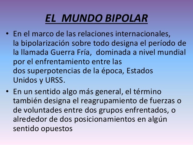 Bipolarización Mundo bipolar o Sistema bipolar término empleado para referirse al equilibrio de poder existente en la Guerra fría entre el bloque comunista liderado por la Unión Soviética y el capitalista liderado por los Estados Unidos y que persistió hasta la caída del. De la desintegración de este país surgieron. Ad Find Information About Bipolar Depression Get Helpful Tips and Resources Today.