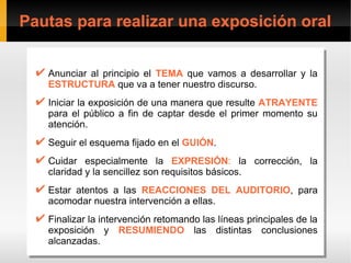 Cómo conseguir exposiciones orales efectivas II Guion para la planificación de una exposición oral de tipo expositivo Descripción breve de nuestro auditorio Debemos enumerar las características.
