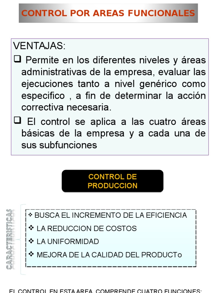 Control por areas funcionales. CONTROL DE PRODUCCIÓN La función de control en esta área busca El incremento de la eficacia la reproducción de costos y la. La función de control en esta área busca El incremento de la eficacia la reproducción de. CONTROL POR ÁREAS FUNCIONALES.