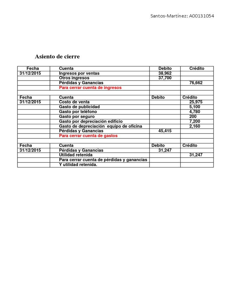 Santos Martinez Asiento De Cierre Pdf Depreciacion Tarjeta De Debito