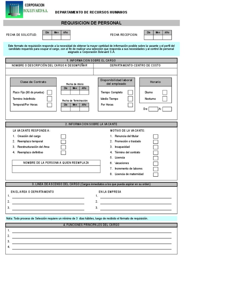 La requisición de personal es un documento de solicitud interna que el responsable de alguna de las áreas funcionales extiende hacia el área de recursos humanos es detonador para comenzar un proceso de reclutamiento y selección basado en una vacante generada. La requisición de personal es la solicitud que realiza un área de la Empresa para cubrir alguna vacante disponible y que considera los requerimientos personales escolares laborales y de experiencia del candidato así como las características del puesto.