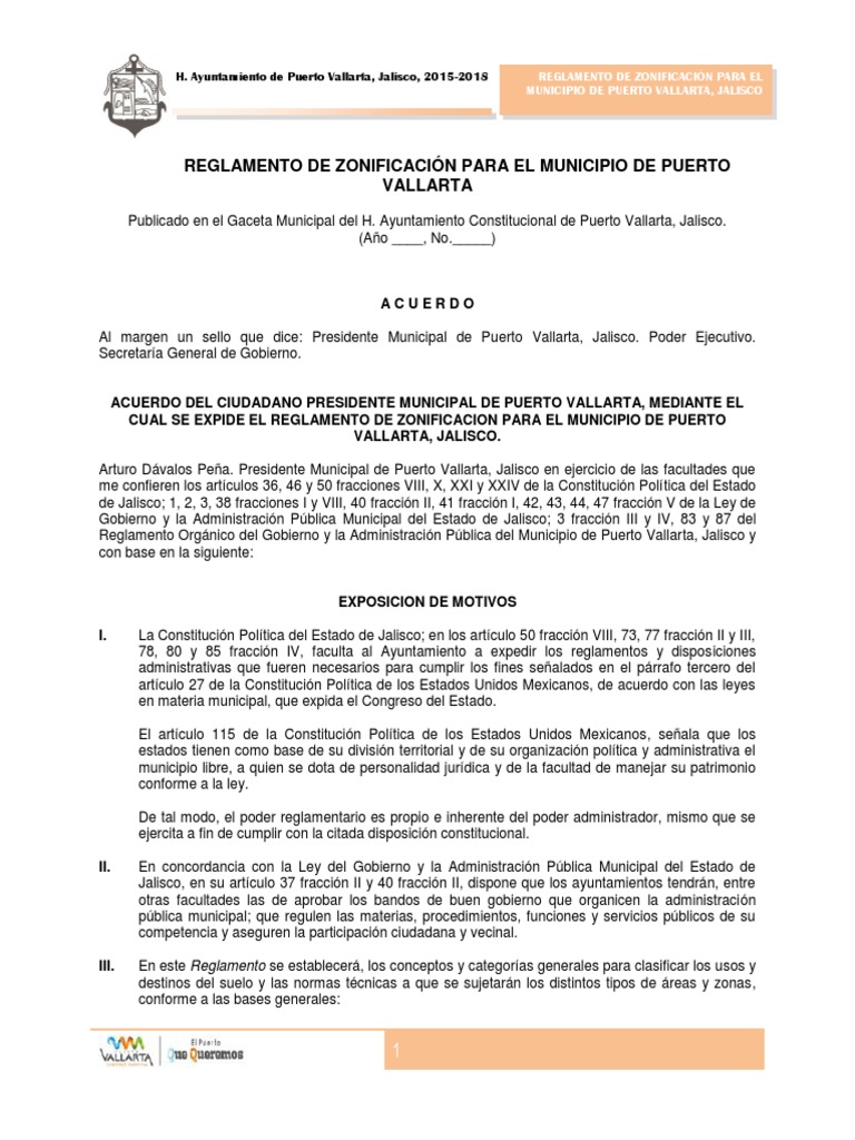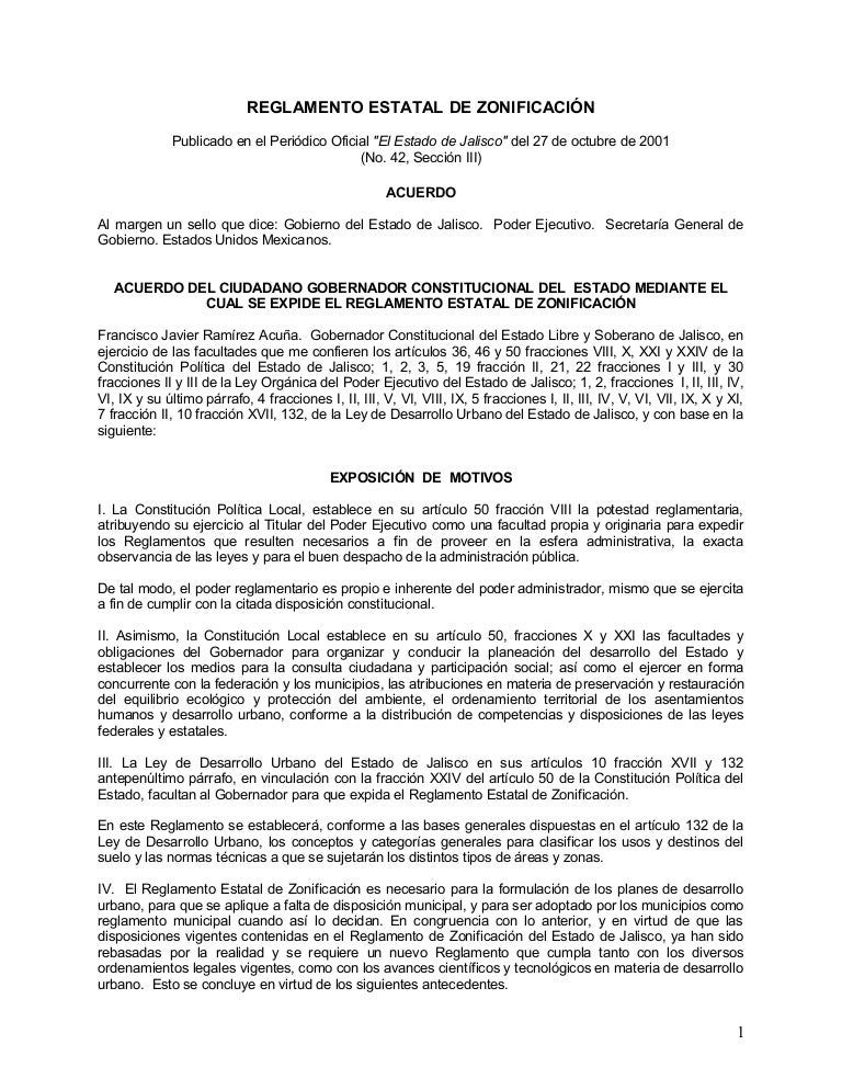 Reglamento estatal de zonificaciÓn a c u e r d o acuerdo del ciudadano gobernador constitucional del estado mediante el cual se expide el reglamento estatal de zonificacion exposicion de motivos i-ii-iii-iv-publicado en el periódico oficial del 27 de octubre de. Gobierno del Estado de Jalisco.