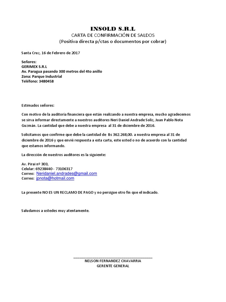 Carta De Confirmacion De Saldos Pdf