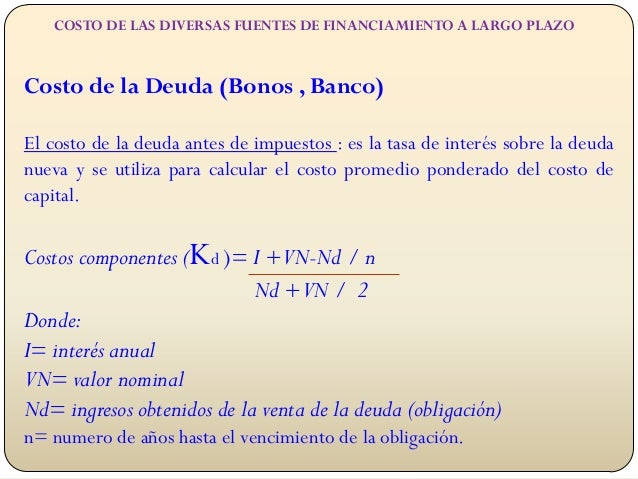 Costo de la deuda a largo plazo. Fórmula del Costo de la Deuda a Largo Plazo. Es el costo del financiamiento asociado con los nuevos fondos recaudados con prstamos a largo plazo. Por ello toda fórmula que consiga reducir el.