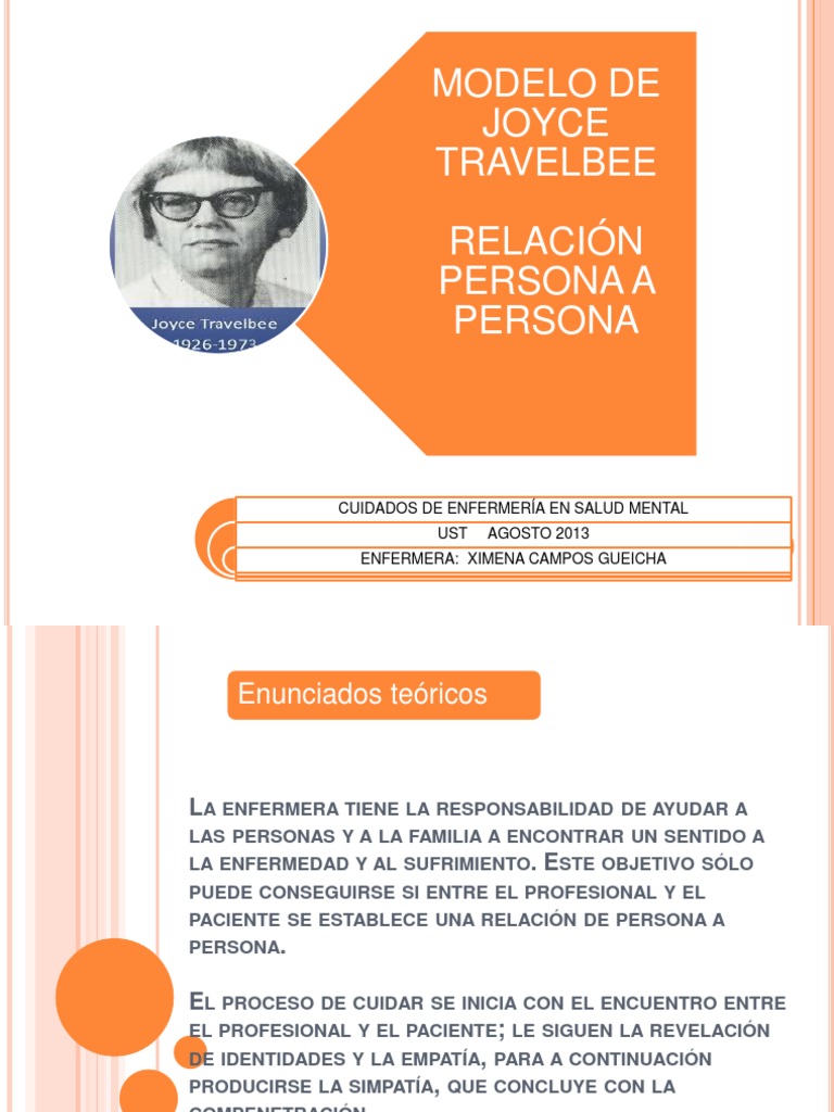 Joyce travelbee teoria persona a persona. Enfermera que ejerció y enseño enfermería psiquiátrica y escribió sobre ella. Dar sentido a la enfermedad y utilizar la experiencia como experiencia del desarrollo del crecimiento Joyce Travelbee identifica las siguientes fases de la relacin enfermerapersona. MODELO DE RELACION DE PERSONA A PERSONA.