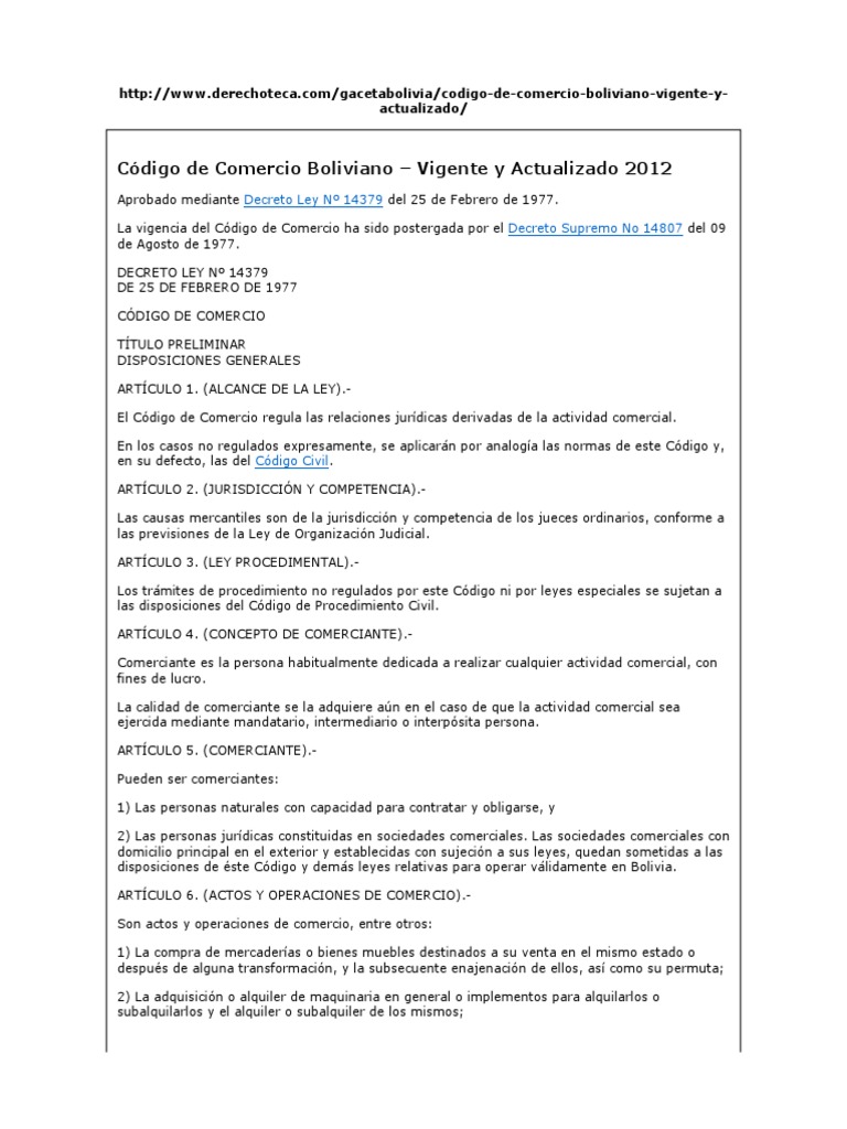 CÓDIGOS DECRETO LEY NORMAS CON ÍNDICE Publicado en Gaceta Oficial de Bolivia. 1 La compra de mercaderías o bienes muebles destinados a su venta en el mismo estado o después de alguna transformación y la subsecuente enajenación de ellos así como su. CODIGO DE COMERCIO DECRETO LEY Nº 14379 GRAL.