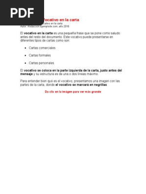 El vocativo en la carta es una pequea frase que se pone como saludo antes del resto del documento. Cartas comerciales Cartas formales Cartas personales El vocativo se coloca en la parte izquierda de la carta justo antes del mensaje y su estructura es de una.