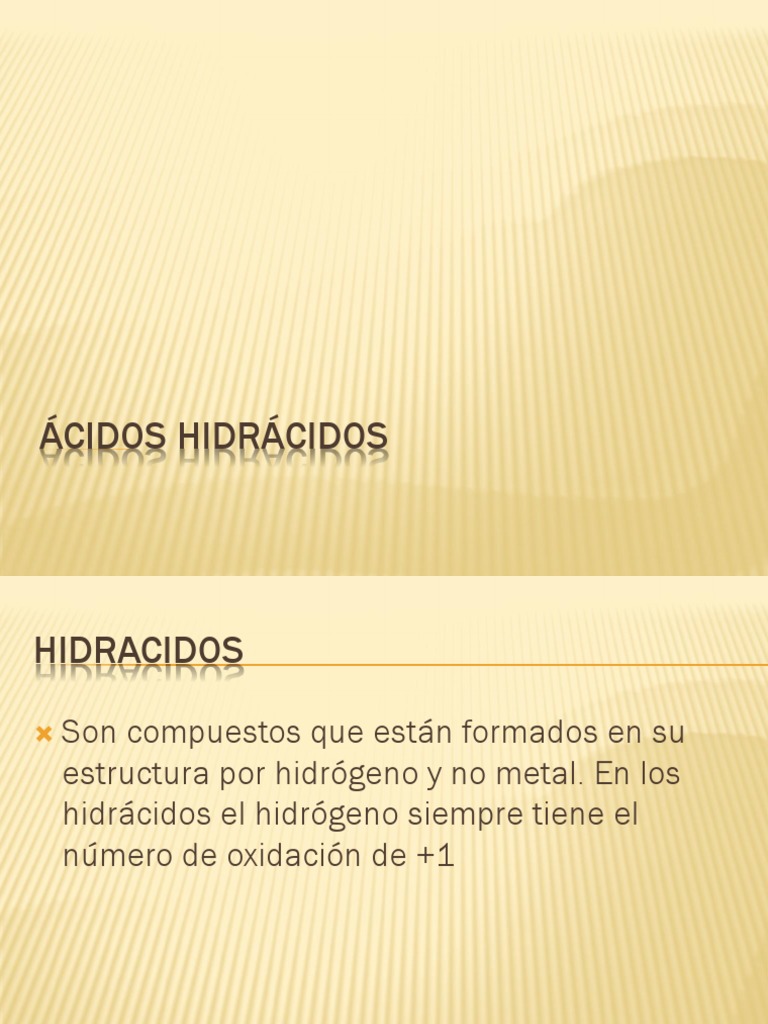 Los hidrácidos también llamados ácidos hidrácidos o hidruros no metálicos son combinaciones binarias entre hidrógeno junto a los halógenos F Cl Br I exceptuando el At y con los anfígenos.