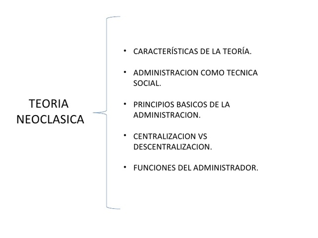 -Énfasis en la práctica de la administración - Reafirmaciones positivas de los postulados de la teoría clásica - Énfasis en los principios generales de la administración - Énfasis en los objetivos y resultados -Organización -Dirección -Autoridad y poder -Control.