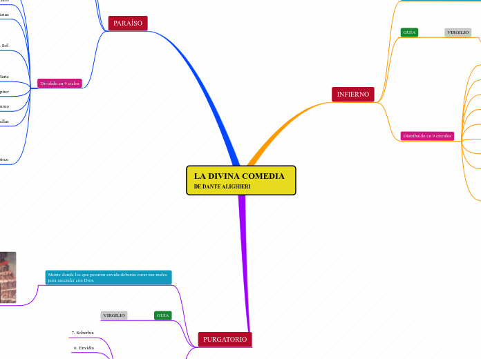 Este mapa conceptual tiene todo un resumen de. A continuacion se presenta un esquema el cual contiene casi todo el resumen del libro la divina comedia de Dante Alighieri este se divide en 3 partes.